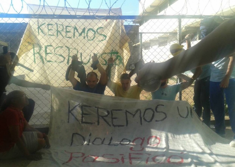 Reos del penal de Tocuyito, en el estado Carabobo, amarraron a los cuatro presos políticos recluidos en el recinto en una cerca, con carteles y granadas en manos.