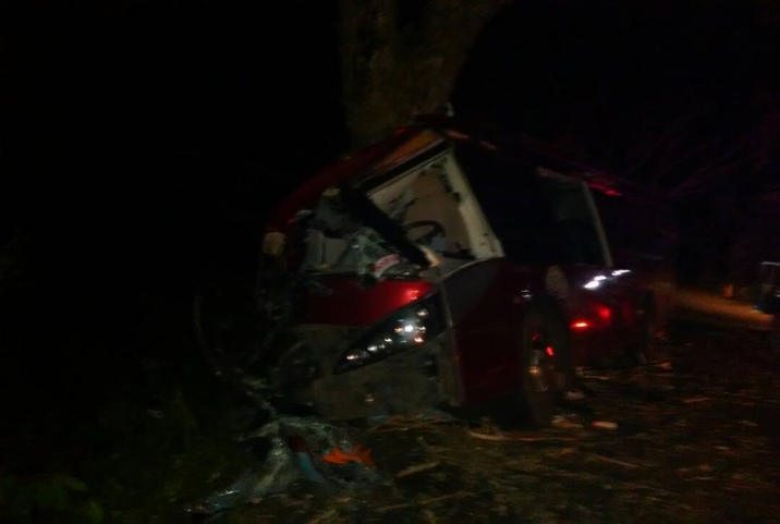 Un autobús marca Yutong, modelo ZK6896HGA, color rojo, sin placa chocó de frente con un árbol luego de que se saliera de la vía.