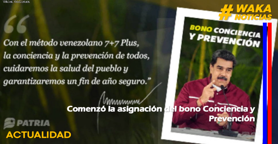 (Waka Noticias. Puerto Ayacucho, 24/11/2020).- Este lunes comenzó la asignación de un nuevo beneficio “especial”, denominado Bono Conciencia y Prevención, dirigido a personas registradas en la plataforma Patria. El anuncio se realizó a través del blog asociado al mencionado sistema.