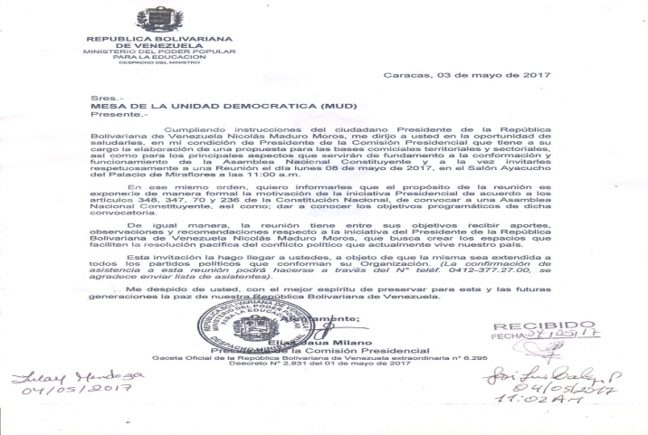 Por medio de su cuenta en la red social Twitter, el presidente de la Comisión para la Asamblea Nacional Constituyente, Elías Jaua, se dio a conocer que la Mesa de la Unidad Democrática (MUD), recibió este jueves la invitación oficial para participar en reunión sobre la Constituyente.