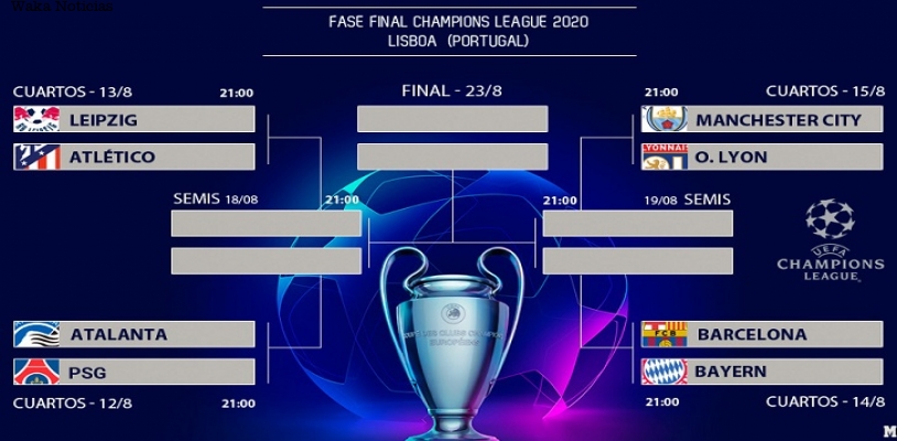 (Waka Noticias. Puerto Ayacucho, 09/08/2020).- Ya se conocieron los ocho equipos que se jugarán esta Liga de Campeones en la final a ocho que se disputará en Lisboa desde el 12 hasta el 23 de agosto. Leipzig, Atlético de Madrid, Atalanta, PSG, Manchester City, Olympique de Lyon, Barcelona y Bayern Múnich lucharán por levantar la ‘Orejona’ en apenas quince días en la capital lusa.