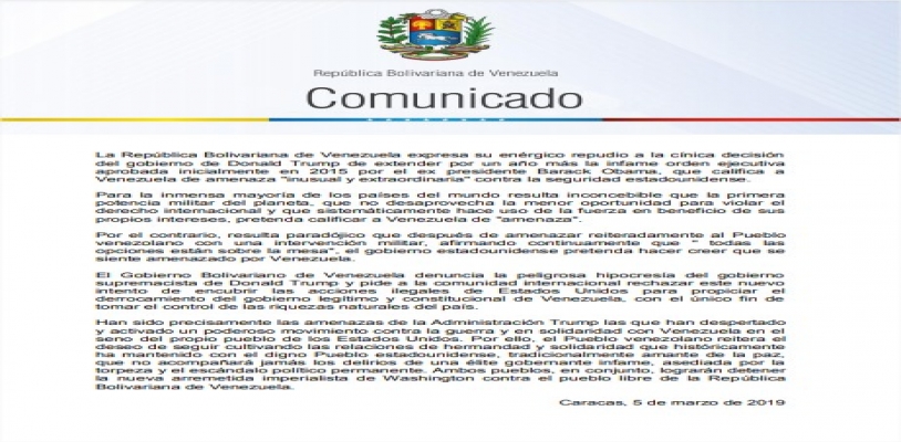 Asimismo la Cancillería emitió un comunicado en el “expresa su enérgico repudio a la cínica decisión del gobierno de Donald Trump de extender por un año más la infame orden ejecutiva aprobada inicialmente en 2015 por el ex presidente Barack Obama, que califica a Venezuela de amenaza “inusual y extraordinaria” contra la seguridad estadounidense”.