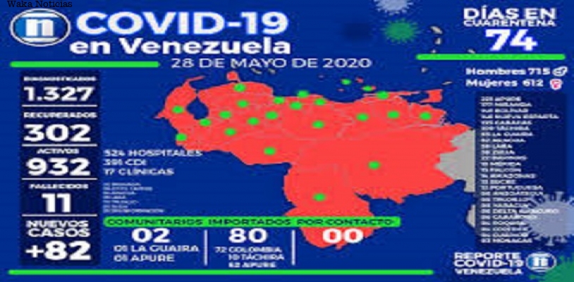 (Waka Noticias. Puerto Ayacucho, 29/05/2020).- La cifra de casos de Covid-19 en Venezuela subió este jueves a 1.327 al reportarse 82 nuevos en las últimas 24 horas, según anunció el gobernante en disputa Nicolás Maduro.