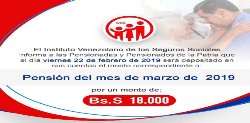 “El IVSS informa a todos los pensionados y pensionadas de la Patria que este viernes 22 de febrero será depositada en sus cuentas la pensión correspondiente al mes de marzo por un monto de 18 mil Bs”, difundieron en la cuenta Twitter del IVSS.