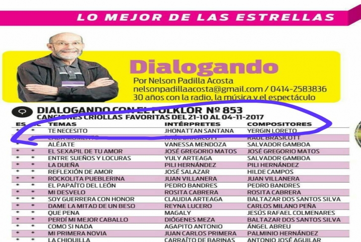 Por otro lado, el joven cantante apureño el pasado domingo 22 de Octubre en el Diario Meridiano en la Columna Dialogando con el Folklore del maestro Nelson Padilla Acosta se dio a conocer la lista de los temas mas sonados a nivel nacional donde el cantante Jhonattan Santana se ubica en la Primera posición con su nuevo exito Te Necesito. Una producción 2017 que aun se esta cocinando de los cuales se desprenden por ahora el Tema Amor con Amor se Paga del cual es autor y el Tema Te Necesito de la Pluma del excelente musico Guariqueño Yergin Loreto. Es Importante señalar que es la segunda vez que nuestro amazonense Jhonattan Santana alcanza esta posicion, primero lo hizo con su exito Nacional Le Hace Falta Amor y ahora con este nuevo Exito. Seguimos augurandole muchos exitos a este coplero a Nivel Nacional