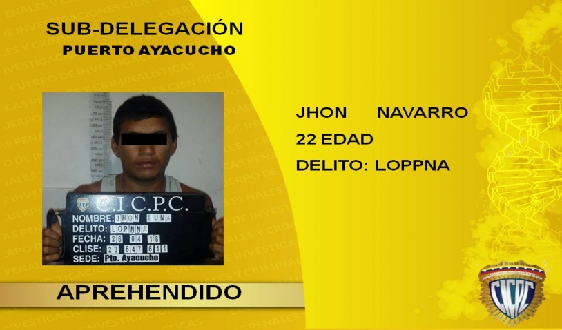 Funcionario del C.I.C.P.C. sub delegación Puerto Ayacucho realizaron la aprehensión de Jhon Navarro de (22) años de edad por el delitos cometidos en ley orgánica para la protección del niño y del adolescente (LOPPNA).